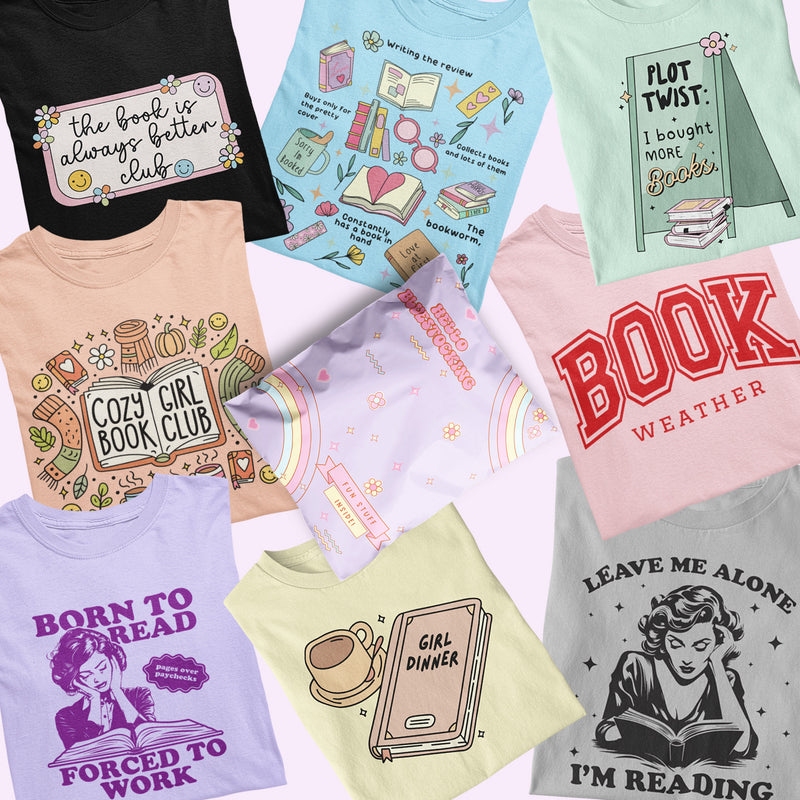 We’re a small, slightly chaotic, totally book-obsessed, family-run and woman-owned business fueled by caffeine, literary puns, and the firm belief that there’s always room for one more book-themed t-shirt. Born from a love of stories (and a healthy disregard for shelf space), we create book inspired items that let you wear your reader heart on your sleeve—sometimes literally. Basically, if your idea of a good time includes ignoring reality for a hardcover and a snack, you’re in the right place. Think of us as your literary enablers—because buying bookish merch totally counts as supporting the arts. Right?